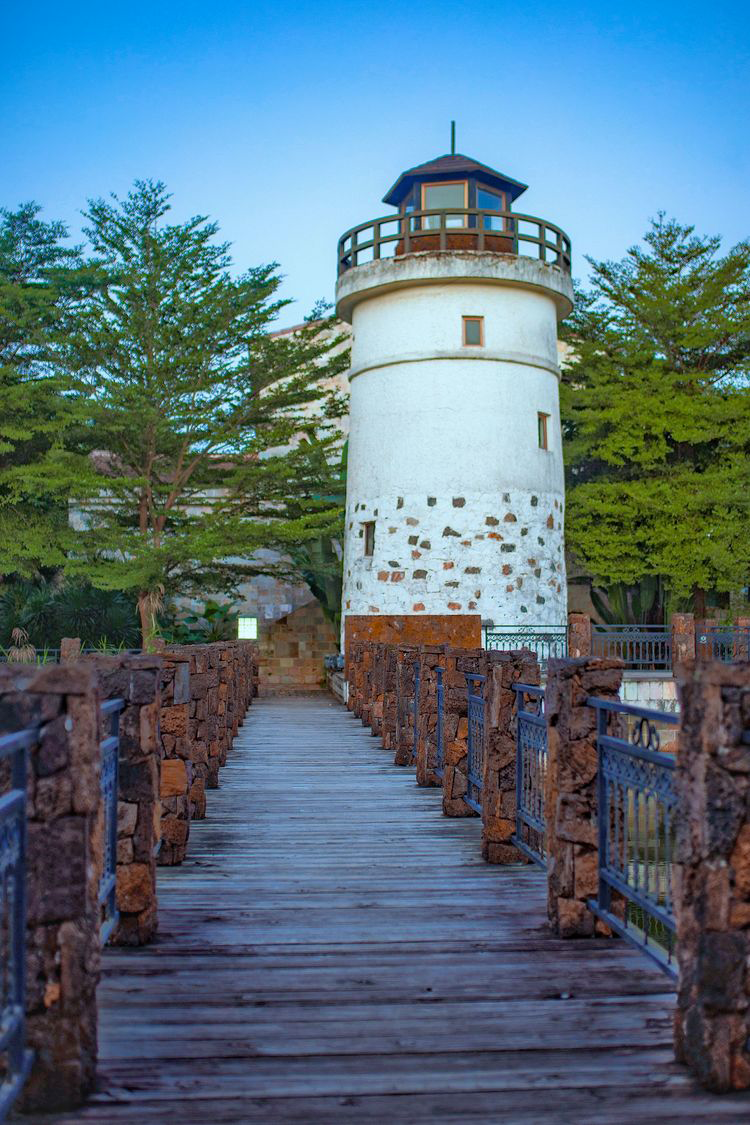 酒店主楼充满欧式风情,立于湖边,石墙圆窗,远处别墅群则是独特的摩洛哥风,不规则的墙体,盘旋的阶梯,异域建筑般的复古与神秘。