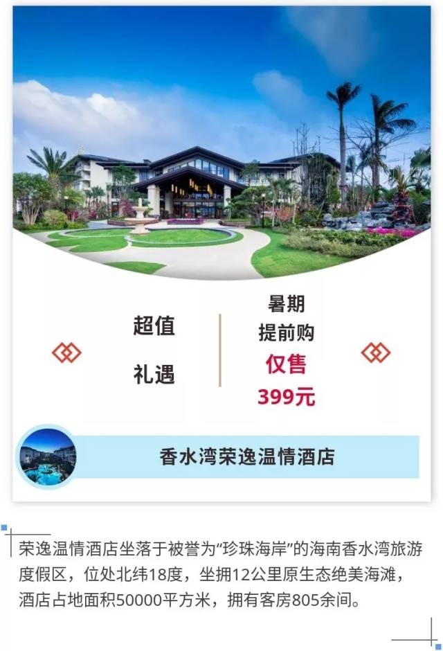 荣逸温情酒店由荣盛发展投资兴建,酒店坐落于被誉为“珍珠海岸”的海南香水湾旅游度假区,与全球最著名的度假胜地夏威夷、迈阿密、加勒比海同处北纬18度。酒店坐拥12公里原生态绝美海滩,这里阳光和煦,空气清新,水清沙幼,是远离都市喧嚣的亲子乐游之地。